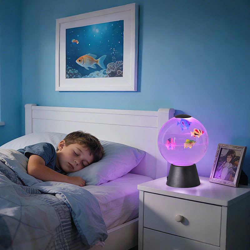 कुनै पनि ठाउँमा अद्वितीय उच्चारण, यो फिश ग्लोबले चंचल एनिमेसनको साथ सुखदायक प्रकाश प्रभावहरू संयोजन गर्दछ