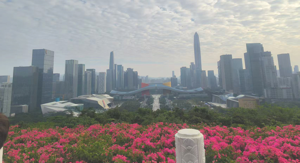२० मिनेटको आरोहण पछि, सबैजना शिखरमा पुगे! कामरेड देङ सियाओपिङको काँसाको शालिकको अगाडि उभिएर सेन्जेन सहरलाई हेरेर म भावुक भएँ।
