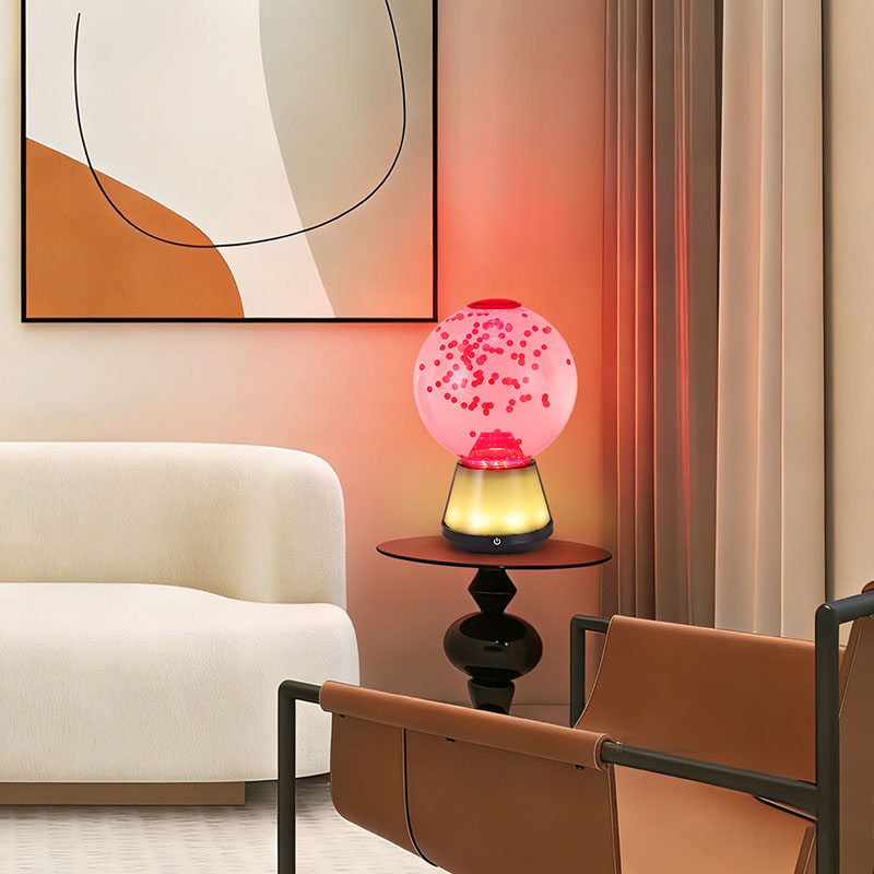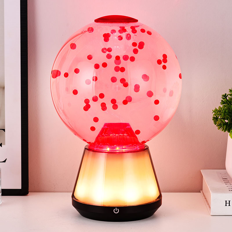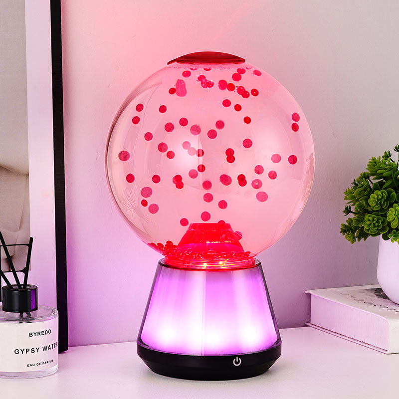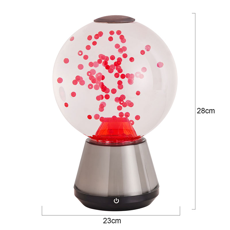 बत्तीमा गोलाकार बल आकारको डिजाइन छ जसमा चम्किलो फिनिस भएको छ जसले प्रकाशलाई सतहहरूमा सुन्दर ढंगले प्रतिबिम्बित गर्न अनुमति दिन्छ विश्व भित्र सयौं स-साना रातो गोलाहरू शान्त परिसंचरण पम्पद्वारा सञ्चालित लयबद्ध छालहरूमा माथि माथि तैरिन्छन्। रातो सुन्तला रङ पहेँलो नीलो बैजनी र हरियो सहित विभिन्न रङहरू मार्फत साइकल चलाउँदै सधैं परिवर्तनशील दृश्य अनुभव प्रदान गर्दछ
