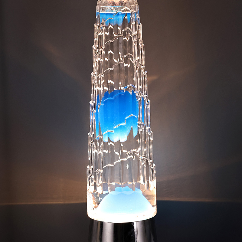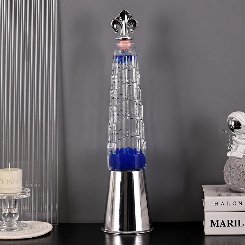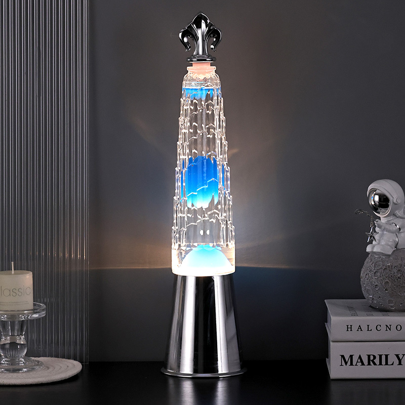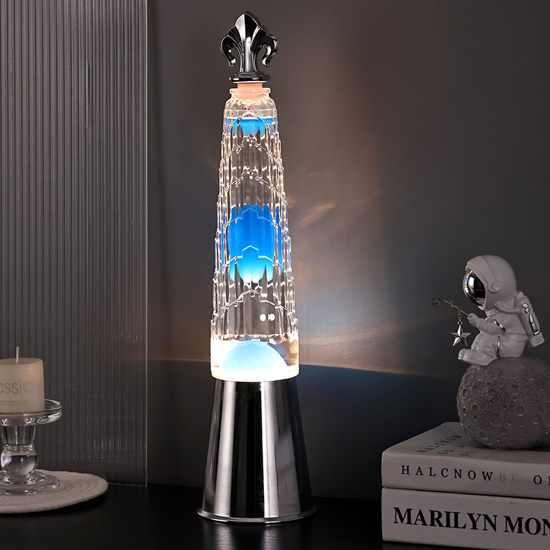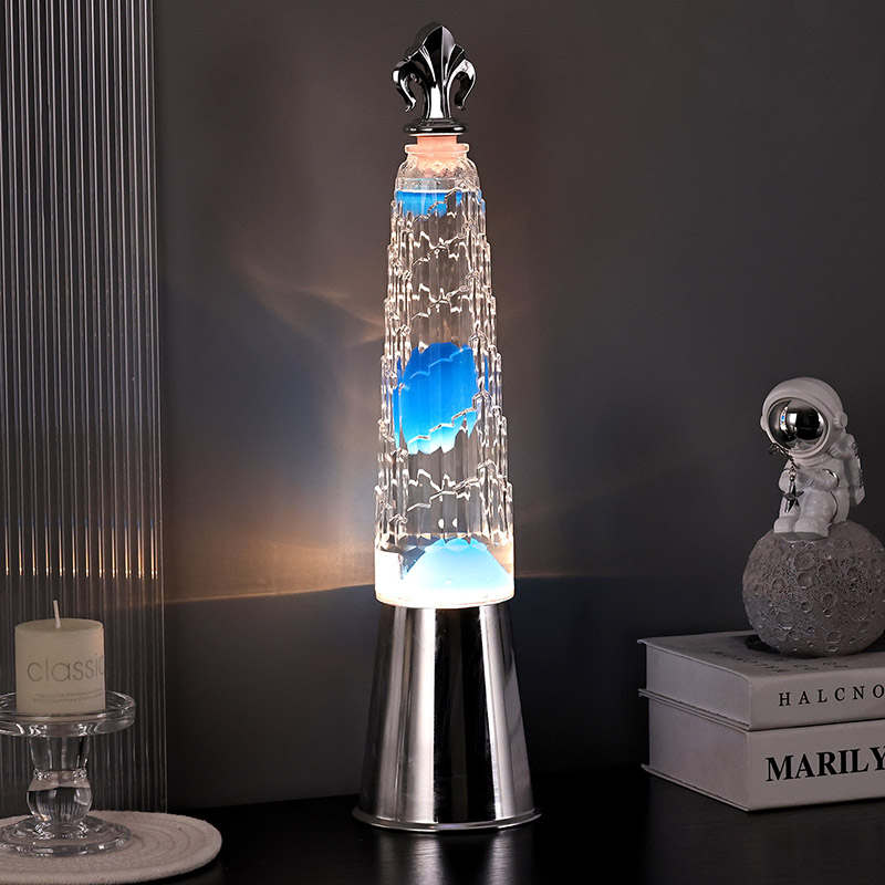 टावर शेड लाभा ल्याम्प टेबल ल्याम्पले क्लासिक टावर आकारको डिजाइन प्रस्तुत गर्दछ, उत्कृष्ट कालो धातुको सजावट शीर्षमा इम्बेड गरिएको, सरल तर उत्कृष्ट। पारदर्शी काँचको बोतल भित्र, निलो मोम अवस्थित छ